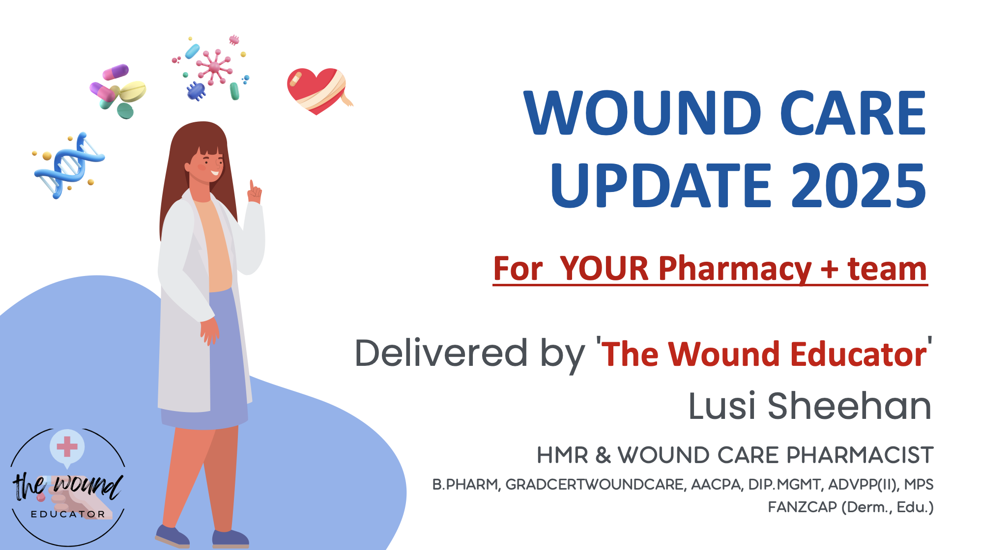 Vision: 'Improving wound care literacy and minimising harm' with over 10 years of experience, Lusi has delivered wound care education for peak allied health and wound care organisations, and universities in the areas of wound care management and dermatology. Lusi established pharmacy-based Wound Care & Compression Clinics in WA and help other allied health professional to improve their wound care services and provide evidence-based wound care protocols. She provides wound care updates for GP clinics, pharmacies, aged care facilities and created the APC accredited course 'The Wound Care Course for Pharmacists + Team'. Lusi has a post-graduate degree in Wound Care Management from Monash University and is recognised by the ANZCAP as a pharmacy consultant in the speciality areas of Dermatology and Education.